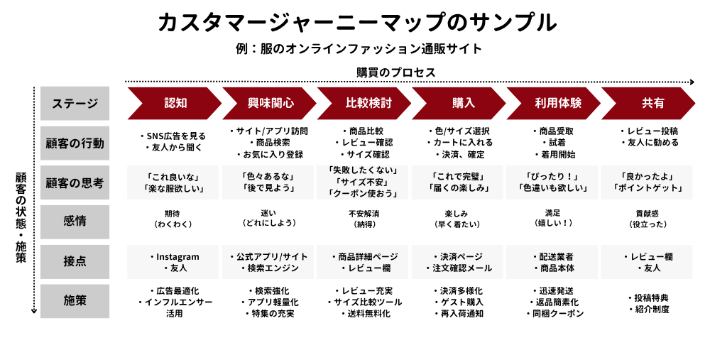 • 顧客の行動:各ステージで実際にとる具体的な行動