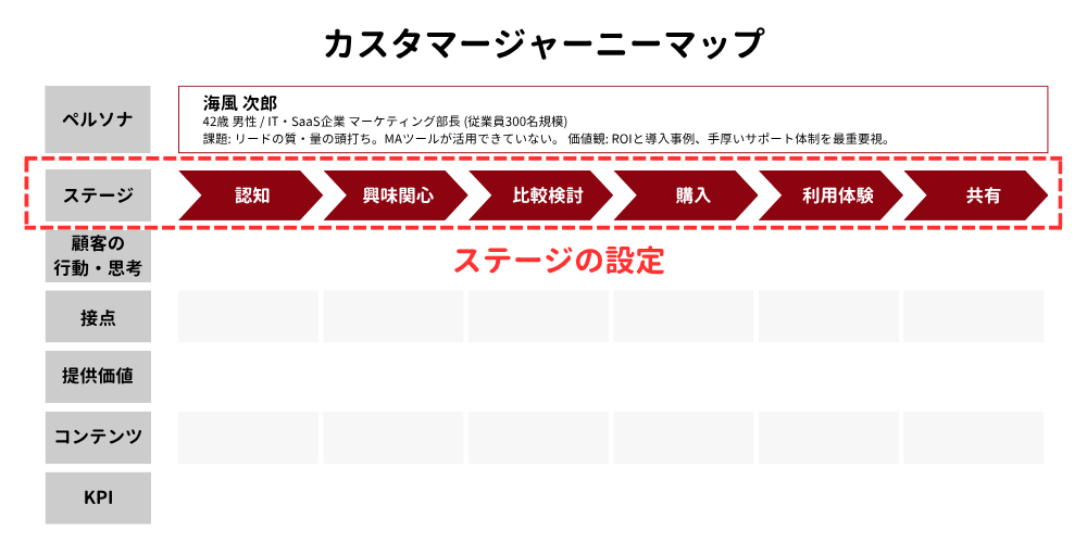 収集した情報を基に、カスタマージャーニーマップを図表化します。横軸には顧客の心理や行動の変遷を示す「ステージ(プロセス)」を設定し、縦軸には以下のような要素を配置します。