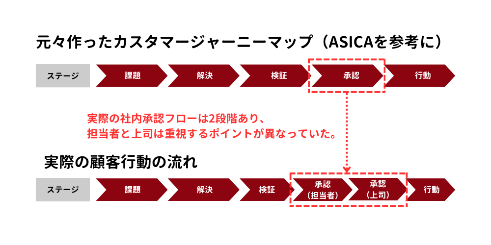 とある製造業C社(従業員50名)は、BtoB向けのASICAモデルを参考にカスタマージャーニーマップを作成されていました。「課題→解決→検証→承認→行動」の5段階で整理し、各段階に対策を考えていましたが、数か月運用しても思うような成果が出ません。なぜなら、実際のお客様が辿る流れとマップが大きくズレていたからです。